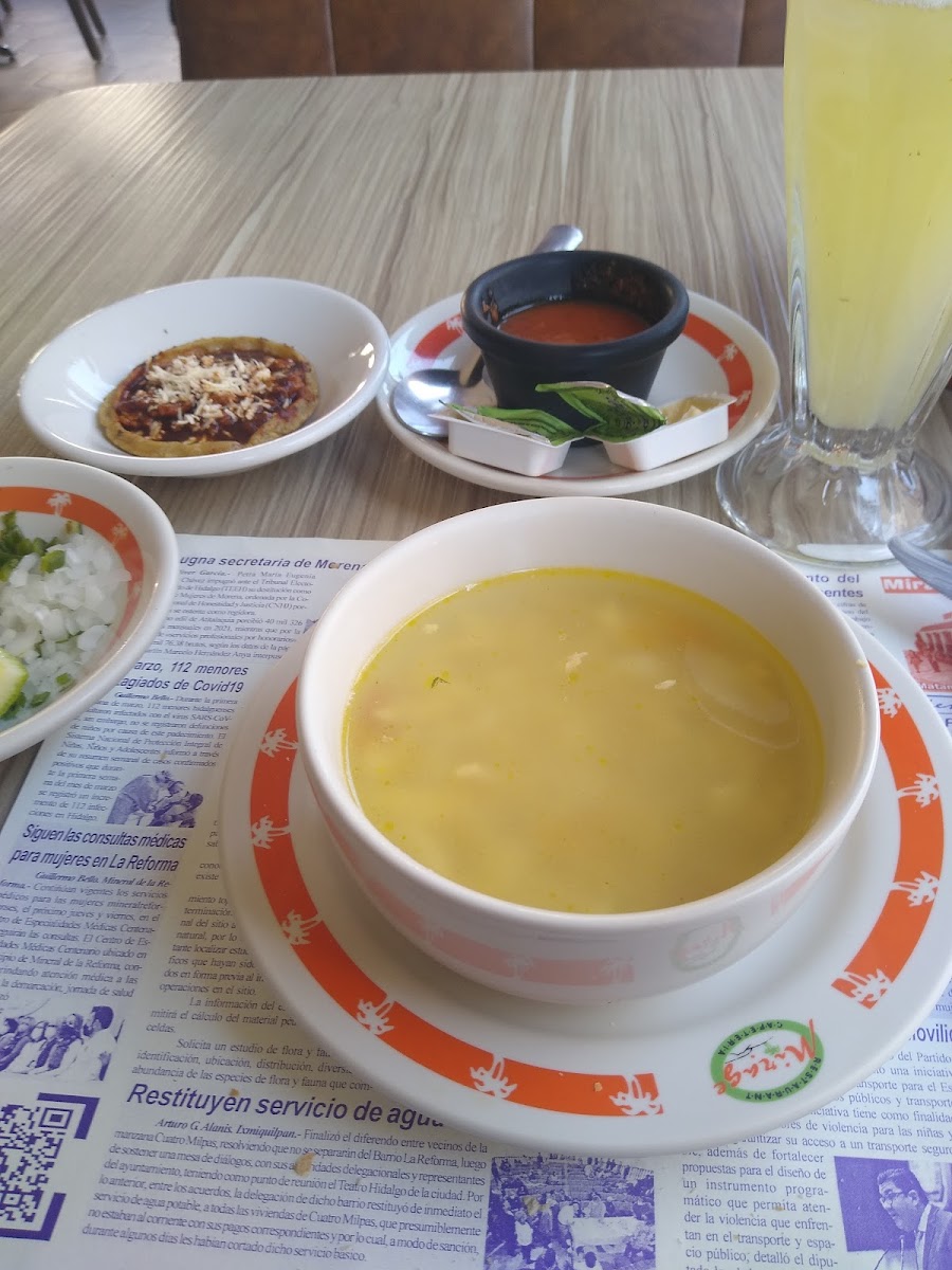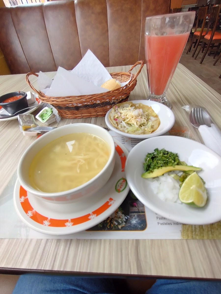 The menu features classic local and regional dishes, with highlights such as Consomé de Pollo, Enchiladas de la Casa, and unique options like Pechuga Rellena de Champiñones that cater to diners seeking familiar flavors crafted with care. House specialties like the Panque de Naranja and Fresh Fruit Waters complement savory dishes, making it a nice spot for breakfast or early lunch.